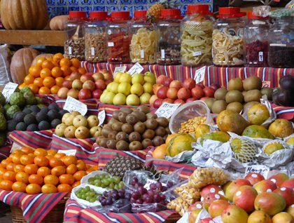 Rising precipitously 5,000 meters from the bed of the sea, the volcanic island that is Madeira has been home to waves of inhabitants for nearly 600 years. The capital, Funchal, was the base of our operations for today. Groups fanned out in many directions after an early morning visit to the market where flowers and fruit seemed to be reflected in the traditional stripes of the vendor’s skirts. Rows of black scabbard fish bared their teeth and we learned of their mysterious lifestyle. No matter which direction one took from there the impressions of the place were similar.