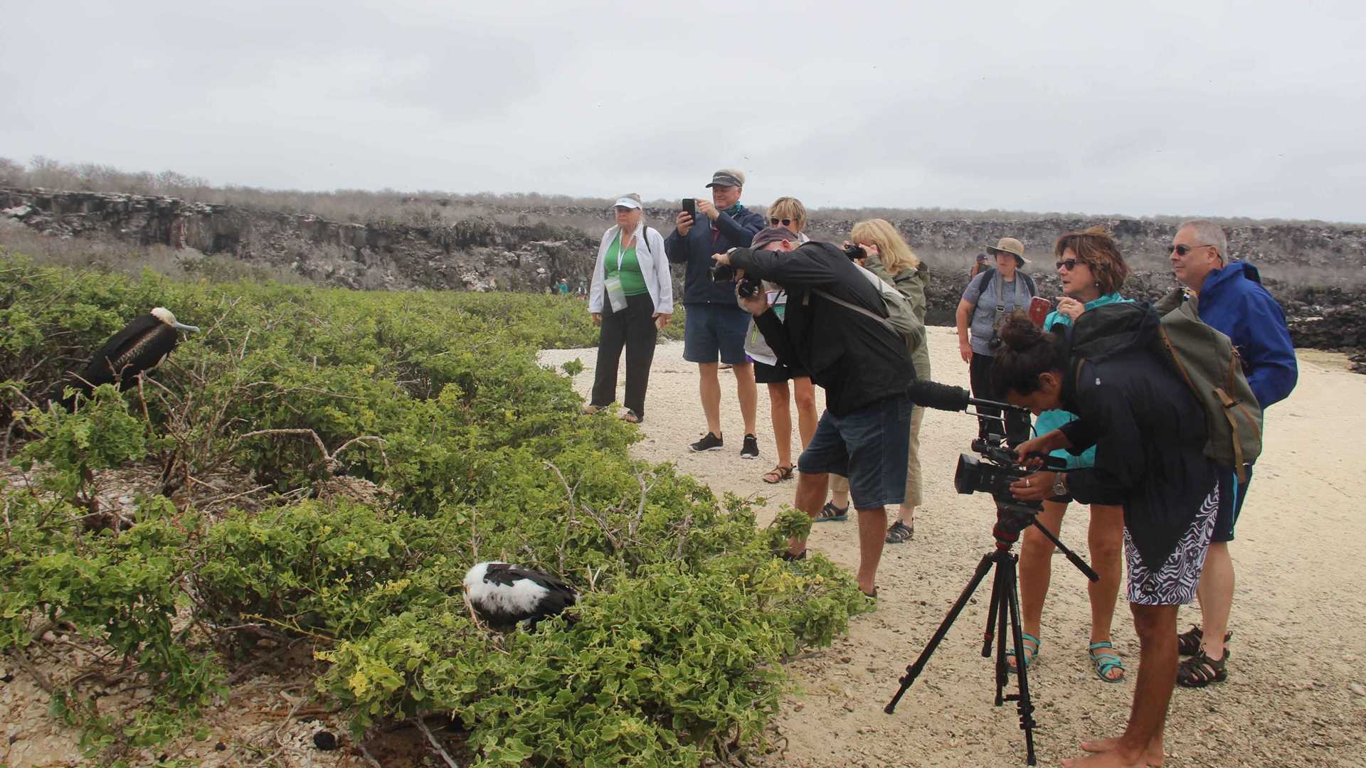 It was a very relaxing and entertaining walk on the sandy area, surrounded by nesting red-footed boobies, frigatebirds and gulls. Frigatebirds in the air impressed the group every time they chased a red-footed booby or a tropical bird to steal their fish, with a full display of their expert flying skills.
