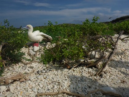 Today we arrived at the last island of our expedition: Genovesa. This lonely rock is populated by more than a million nesting birds, and is known as “Bird’s Island” for this reason. Birds here don’t fear humans and therefore most of the time unphased by our presence. Early in the morning on this warm day, our first activity was kayaking.  After breakfast we landed on Darwin’s Bay, where there is a beach made of broken pieces of white coral and where our trail was located. We did not have to search too far before finding birds, especially the highlight of today’s visit: the red-footed boobies. We also found frigate birds who were feeding their babies as they returned from stealing fish from other birds! After a hot morning, some of us needed to refresh and so we went snorkeling in these waters which were full of big animals like rays and turtles. We even had the chance to see some playful sea lions.
