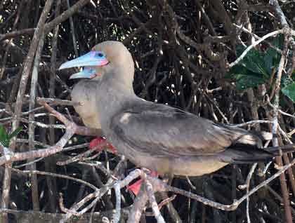 The morning came fast and soon we were landing for our first excursion at the beach of Darwin Bay. Its white color contrasted with the birds, the trees, and even the insects which captivated the attention of our guests. We walked along the narrow trail that leads to nesting areas of different species of birds. We observed swallow tailed gulls incubating their eggs, red footed boobies collecting nesting material, and baby Nazca boobies we saw two weeks ago which have grown and some are about to fledge.  In the air, inquisitive frigate birds harassed some tropic birds trying to steal their food. We arrived at the end of the beach where lava and yellow crowned night herons tried to catch some fish along the shallows where playful Galapagos sea lions enjoyed the calm waters, floating indifferently with their eyes completely closed due to the intense sun.
