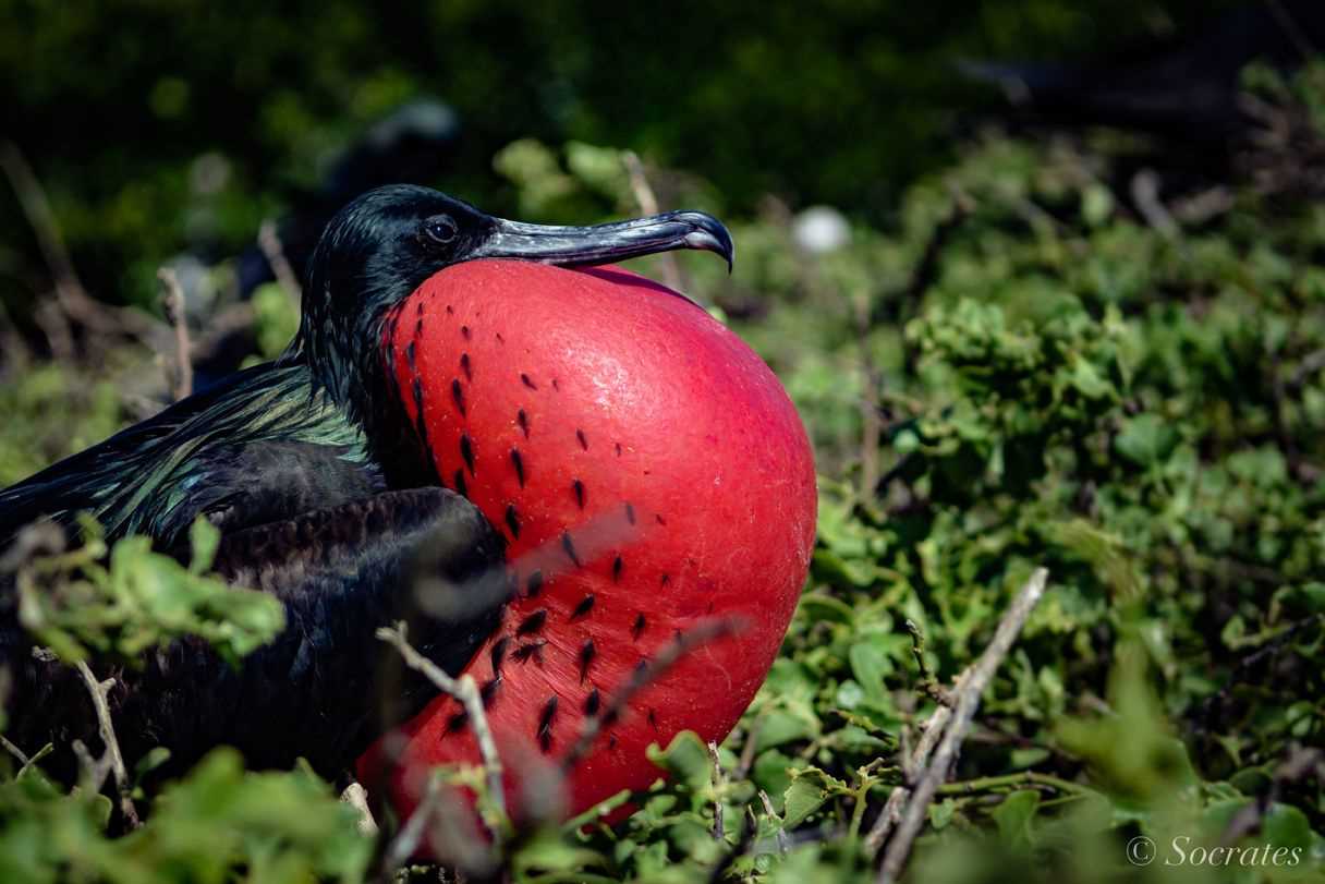 The feel, smell, colors, sounds are a unique combination of seabird, guano, ocean, incense tree and warm, humid air. Red-footed boobies, great frigatebirds, occasional sea lions, swallow-tailed gulls, small marine iguanas, Galápagos fur seals, hammerhead sharks. Moans and groans, clacking bills, clucking trills, squawks, and drumming. The sound static underwater broken by squeals of excitement at sightings. The whistling of feathers overhead. The splat of guano on deck.