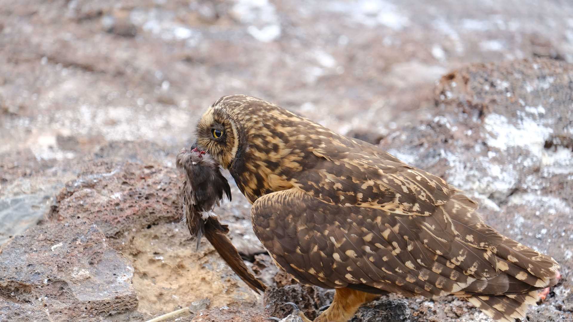 Genovesa is a low and flat island, located on the northern hemisphere, and home to over one million seabirds. Due to the isolation of this island, there are no land reptiles have ever settled here, leaving this place solely to the various winged species of the archipelago. Our morning begins with a walk along Prince Philip’s Steps location, inland. We find Nazca, red-footed boobies and frigatebirds. All of the desert vegetation, such as palo santo and muyuyo trees looked still gray, as the rain has not started yet. Along the trail, we are also able to spot frigatebird chicks and juveniles being fed by their parents. On the rocky terrain, we observe hundreds of lava tubes, and thousands of storm petrels fluttering along the seashore, as they try to land. Short-eared owls, the only diurnal predator on the island, are seen hunting. Our young guest Kaden captured an incredible moment on camera!