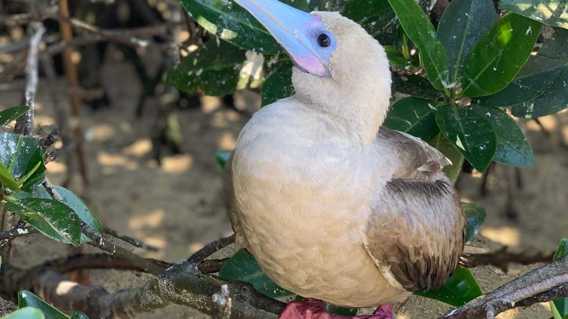 Later in the afternoon, we lead our guests up the steep and rustic steps and across the point of the island to search for petrels and short-eared owl, which is consider the top predator of the island, due to the lack of Galapagos hawks. We identified the large ground finch and the unique sharp-billed ground finch feeding on dry seeds along the lava rocks. On the bushes we admired the many fluffy baby frigates in their nests and the much larger juvenile Nazca boobies. Out on the flat lava flow many storm petrels were swooping around and disappearing into their nest holes. We found several of the well camouflaged short-eared owls that were hunting these numerous petrels.