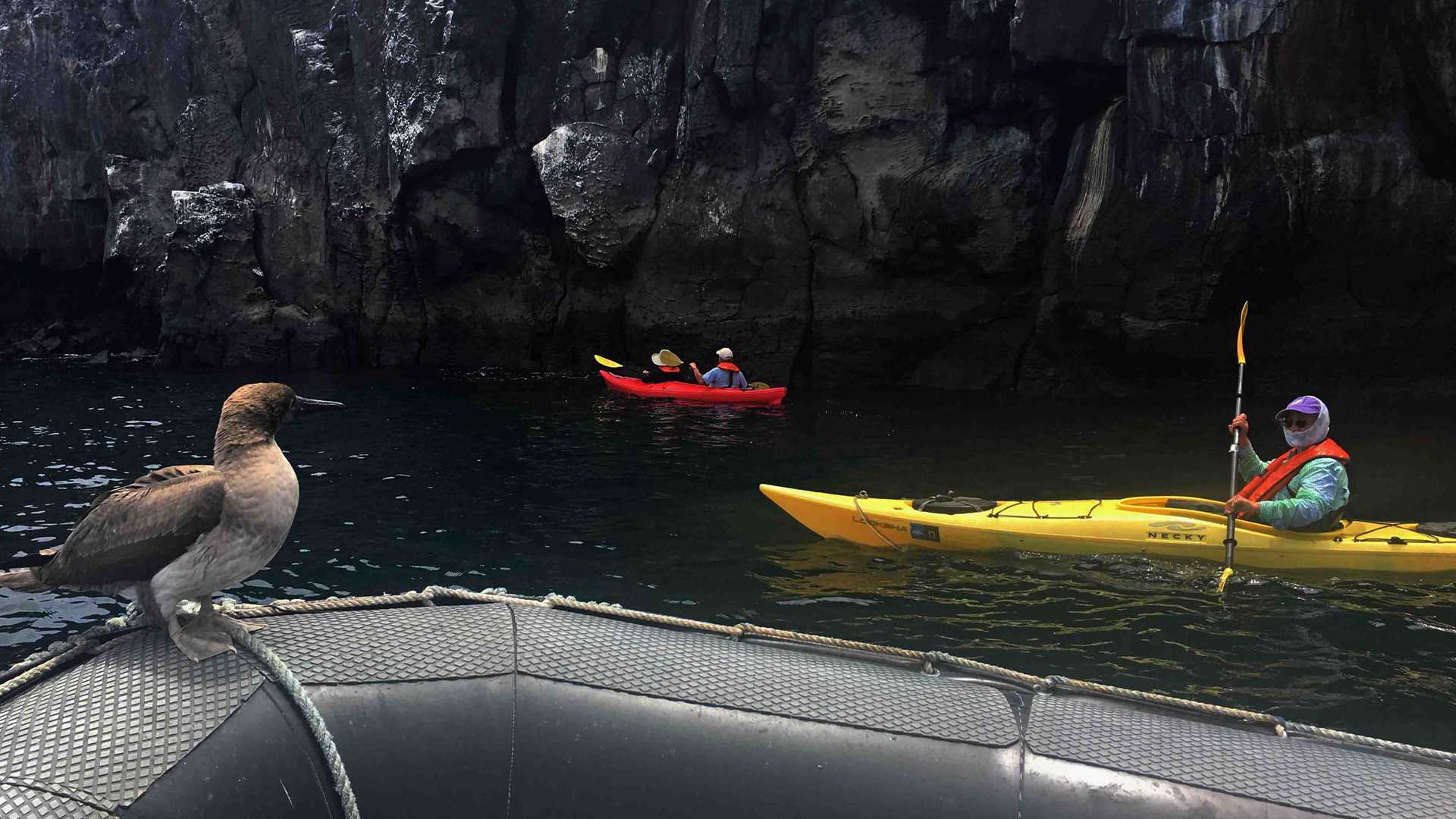 Right after breakfast we are ready to explore. Some guests visit a site called Prince Phillip’s Steps, named when Prince Phillip visited the place. Here we look first for the Galapagos fur seals, a species that was hunted for its fur but is now well protected and likes to hang out in caves along these cliffs. Right after landing, we spot Nazca boobies nesting, great frigate birds, and our first red-footed boobies. Shearwater and storm petrels appear as we get to the outer side of the island.