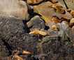 While hikers were discovering some of George Island’s history, another group was investigating an intertidal pool on the other side of the island. A very brief walk took us to a place where we could see a lighthouse in the distance guiding ships, like ours, safely to their destinations. It did not take us long to discover life in the little pools of water left behind on this rocky shore. As water ebbed out into the inlet, tiny puddles were left between the jagged rocks and smooth pebbles on the shore. In these puddles, hermit crabs did battle while tiny chitons rested just underneath the water. We saw long stipes of bull kelp lying on the shore and sea anemones hiding against dark rocks feeding on tiny fish that wandered a bit too close.