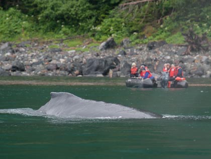 When we were back aboard, the ship repositioned a few miles—passing through the wall of feeding whales again!—to anchor for our final destination of the day. The Inian Passage is the constricted waterway at the entrance to the Inside Passage through which a huge amount of water flows, as the tides change every 6 hours. It is one of the most productive marine areas in the world with phytoplankton-rich emerald green waters that attract all manner of fish, which in turn attract sea birds, eagles, and marine mammals. The surrounding Inian Islands are home to a variety of sea birds, a haul out for steller sea lions, and kelp bed habitat for sea otters. Small boat cruises brought us through this washing machine of currents, and we got great looks at all of these creatures, plus more humpback whales! What an amazingly fun and adventurous ride.