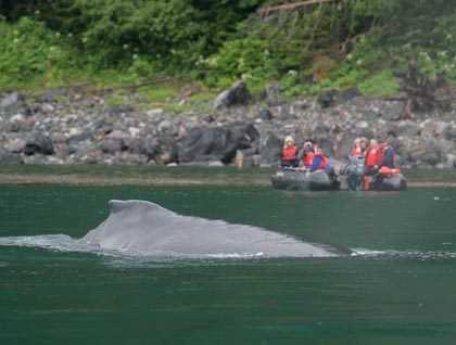 Whew! What a jam-packed second day aboard the National Geographic Sea Bird! It all began around 6:00 a.m. when early risers took in the beautiful sights of Idaho Inlet, along with the first sightings of back-floating sea otters. Then, shortly before 7:00 a.m. came our expedition leader over the P.A… “Good morning ladies and gentlemen… this is a slightly early wake-up call because off the bow we have some humpback whales. It is currently cloudy and 52 degrees. I highly suggest you put on some layers and join us out on deck. Susan will begin her stretch class at 7…” About midway through the morning stretch, another announcement—“If you’re not out on deck you really should be because we have a WALL OF WHALES in front of the ship—at least 20 whales, with some breaching and tale lobbing… come on out and join us!” Hmmm, this was a no-brainer—stretch class dismissed! We stood on the portside, mesmerized by two dozen whales breathing and diving and pec-slapping, and tail-lobbing, and—best of all—baby breaching: two small whales hurling themselves high into the air, over and over again. It was almost like they were performing just for us! We stayed with the whales for half an hour, delaying our breakfast to watch them have theirs. Wow. And all this with a backdrop of layers and veils of clouds and mist clinging to the landscape and water and sky, some of it sprinkling down on the decks and us. What a magnificent welcome to Cross Sound at the head of Icy Strait, the northern entrance to the Inland Passage.