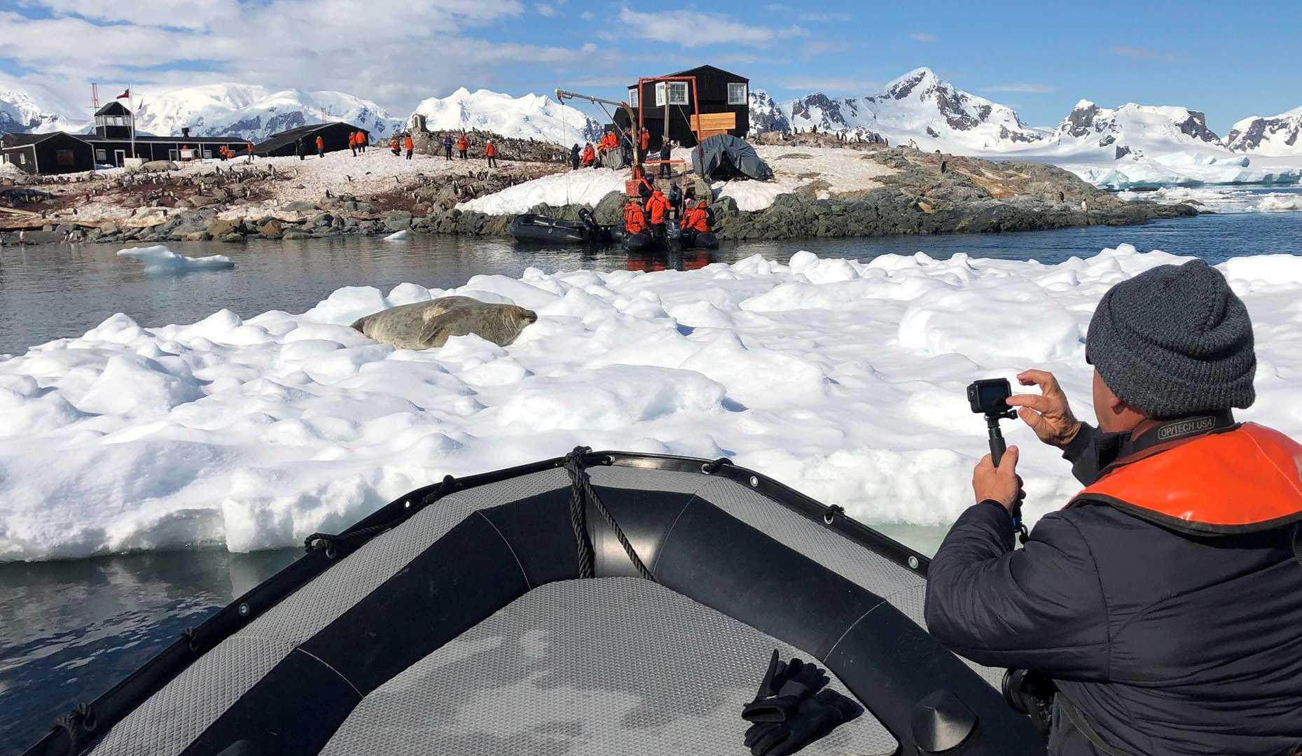 We woke up as National Geographic Explorer stayed anchored just off the Chilean Antarctic base named Gonzáles Videla. This station is manned only in the austral summer as a search and rescue base. It’s home to a great number of breeding gentoo penguins. The Chilean base personnel gave us a warm welcome, and we got to step inside a couple of the buildings, including a small museum with a gift shop. The incredible weather conditions begged us to stay out on deck all afternoon. The scenery towards Dallmann Bay was stunning!