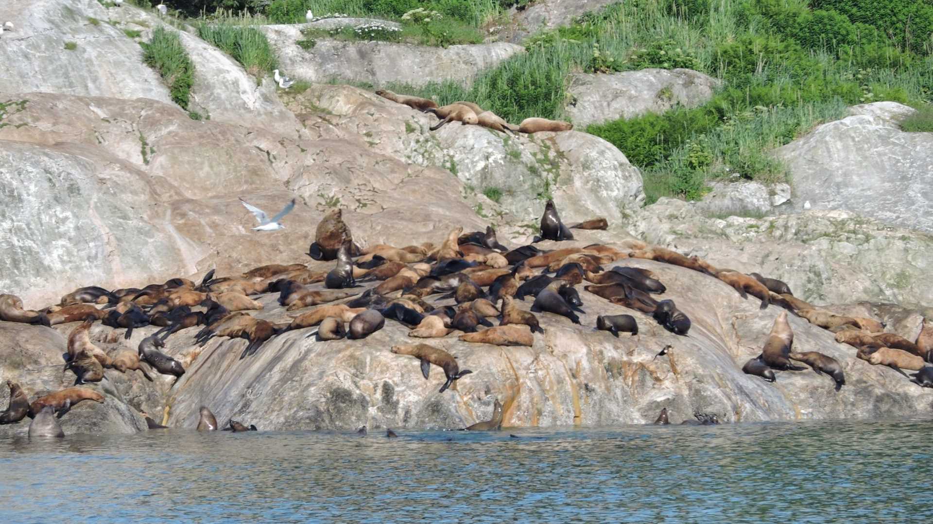 We enjoyed spectacular weather with bright blue skies, a few wispy clouds, very little wind, and surprisingly warm temperatures. In fact, it was necessary to warn guests to guard against sunburn. After breakfast, our ranger, Christina, talked about the sea birds to be seen here just before we reached South Marble Island. This is a small isolated island, which makes for a perfect protected site for breeding seabirds. Pelagic cormorants, glaucous-winged gulls, black-legged kittiwakes, pigeon guillemots, common murres, and both tufted and horned puffins were all seen at the island. In addition, we could see, hear, and smell several small colonies of huge northern (Steller) sea lions. The sea lions stopped breeding here long ago, but a single pup was born here just last week…and we saw it. This was cause for celebration, because this is the first recorded sea lion birth in Glacier Bay in several decades. All the while, humpback whales were blowing and diving off in the distance, but whales are strictly protected here and we were not allowed to approach them. Around mid-morning, Patricia told us about Tlingit life and described how her people have inhabited Glacier Bay area for 10,000 years, apart from being forced out of the bay during heavy glacial activity during the Little Ice Age of the 17th and 18th centuries.