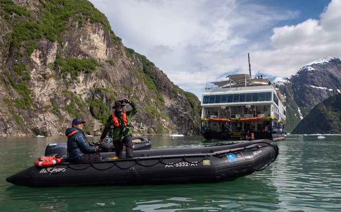 National Geographic Quest entered Glacier Bay from Icy Strait early this morning and headed to the northern-most reaches of the fjord system. We enjoyed beautiful vistas and scenery all day long, and we saw many textbook examples of glaciology, including glaciers, fjords, meltwater streams, moraines, outwash plains, U-shaped valleys, cirques, hanging valleys, glacial flour, glacial scars, plant succession, and more.