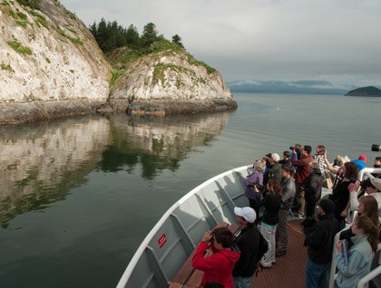 There are calm days at sea, and then there are incredibly calm days at sea, today is one of those incredibly calm days. As all of the guests woke from their slumber and made their way onto the outside deck they could not believe how flat the surface of the waters of Glacier Bay National Park were. The calmness was infectious and it was a particularly quiet morning out on deck. The first sighting of a sea otter was met with meditative awe instead of the normal clamor of rushing to see it and to point it out to everyone else. Today we are joined by two National Park Rangers instead of the usual one. Because this is a family trip we have a larger contingency of children, and one of the Rangers specializes in interpretation for kids. We also have with us Alice Haldane, a native Tlingit interpreter to give us the native culture history of the park.