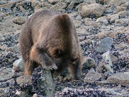 Quietly, quietly and gently (I tried), I made the call over the general announcement system that our first bear of the trip could be seen foraging up a salmon stream. Over the next hour, we found a total of six bears in the area as we sailed between Russell Island and the mainland; several single bears well-spaced apart, a female and her yearling cub, and one lone female traveling the shoreline of Russell Island. She was using her incredible shoulder muscles to overturn large rocks along the way, looking for marine invertebrates underneath, left vulnerable by a low tide. Meanwhile, the soft pink alpenglow on the snow-covered tops of the Fairweather mountain range changed to white as the sun rose higher.