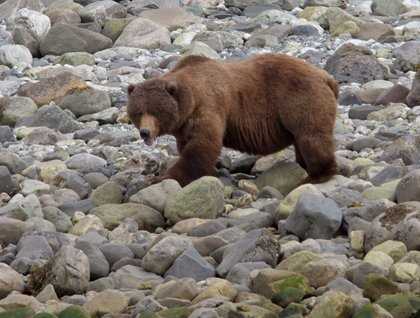 Not too far away from Tidal Inlet, we found a very large coastal brown bear on the beach. Considering the time of the year, when most bears are still recovering the weight lost during their winter sleep, this one was a healthy and well fed. As a source of protein, bears move to the intertidal area to scrape on the barnacles that grow on the rocks, after breaking them with their strong claws, they lick away as much as they can out of the uninviting, but nutritious meal.