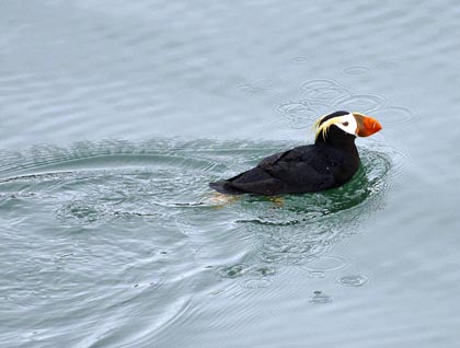 We awoke this morning to overcast skies and calm waters. The stillness in Bartlett Cove was interrupted only intermittently by humpback whales near shore. After picking up Glacier Bay ranger Masaki Mizushima and Tlingit Cultural interpreter Alice Haldan, National Geographic Sea Lion made for South Marble Island to enjoy the scene of the local inhabitants. We could smell and hear the wildlife of the islands before we could see a plethora of Steller sea lions both ashore and frolicking in the water. Puffins buzzed the ship and swam alongside, taking us in. Gulls covered ledges and a solitary bald eagle monitored all the action from atop a rock.