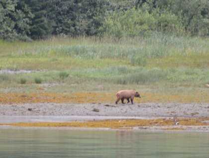 As we traveled up Glacier Bay, we marveled at all the landscape and seascape features trying to imagine what a tremendous glacier filled this large bay just 250 years ago! We went into narrow Tidal Inlet and scanned the coast—all of a sudden, we saw two large brown bears foraging along the coast! With hushed whispers we “ooohed” and “aaahed,” as the bears overturned rocks looking for blenny fish, really just waiting for their feast to begin—the salmon to start returning to the stream! Later, we were lucky to get a good look at a foraging black bear in Geikie Inlet, too!