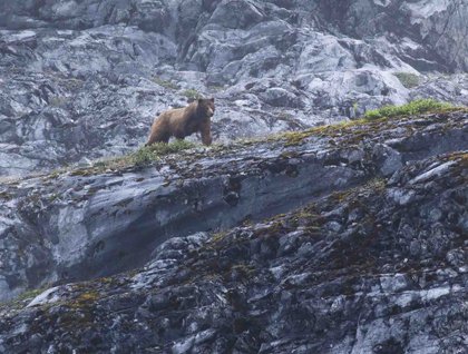 Shortly after breakfast, we passed South Marble Islands and found an abundance of wildlife. What a nice way to start the day! We could hear the calls of the Steller sea lions as we got closer to the shore and multiple bird species circled above. Bird watchers were happy to see pigeon guillemots, black-legged kittiwakes, and mating tufted puffins. As we came into view of Gloomy Knob, the low hanging mist and fog certainly made for a gloomy and eerie backdrop. After only a few minutes of searching, three mountain goats were spotted climbing up the vertical cliff face. While intently watching the mountain goats, we noticed something in pursuit – a mama bear with three cubs! We watched the cubs clumsily stumble after their mother until they disappeared into the fog. Our wonderful morning of wildlife sightings was topped off with sea otters, horned puffins, and, of course, many bald eagles.