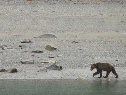 “Bridge, bow—brown and fuzzy 3 o’clock!” Chief mate on watch and naturalists exchange joy and excitement over the hand-held radios as we get closer to the biggest wildlife show of the day—a large brown bear approaching the coast, eyeing the jumping salmon, which are getting ready to go up the stream to spawn. After a bit of scouting, all of a sudden the bear plunged into the water and then stood up on its hind legs in frustration realizing it had still something to learn about how to catch those slippery salmon. The beach seemed a less challenging option, so the bear resumed its search for blennies and crabs under the rocks—at the intertidal food court.