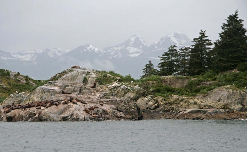 Our first stop today was at South Marble Island. Steller sea lions rested on low rocks, and we listened to their low roars and grumbles. Adorable tufted puffins with bright orange bills bobbed on the water’s surface. Black and white common murres stood in tight row on a narrow rock ledge. When an eagle flew close to the cliff-side kittiwake colony, they all scattered in flight and vocalized.
