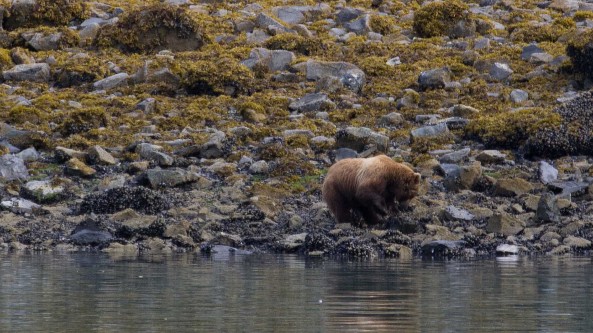 Departing such a scene was difficult but necessary. Once the ship turned and steamed off, and a quick but tasty breakfast had been consumed, it was all hands back on deck for more wildlife. The coastal brown bear, while the same species as the grizzly bear, exhibits quite different characteristics. The coastal brown bear can grow much, much larger than any other bear type, even sometimes exceeding the size of polar bears. A rich diet in salmon facilitates this change, whereas inland brown bears are limited to berries and general foraging. After searching for bears for a short 15 minutes, three coastal brown bears were found in the intertidal zone, perusing the low tide line. These individuals were searching for ocean dwelling goodies; flipping over rocks and searching for mussels, clams, and other small creatures to feast on. This was a bear family – mother first, grabbing the biggest rocks and effortlessly tossing them aside. The cubs followed, probably both 3 years old.