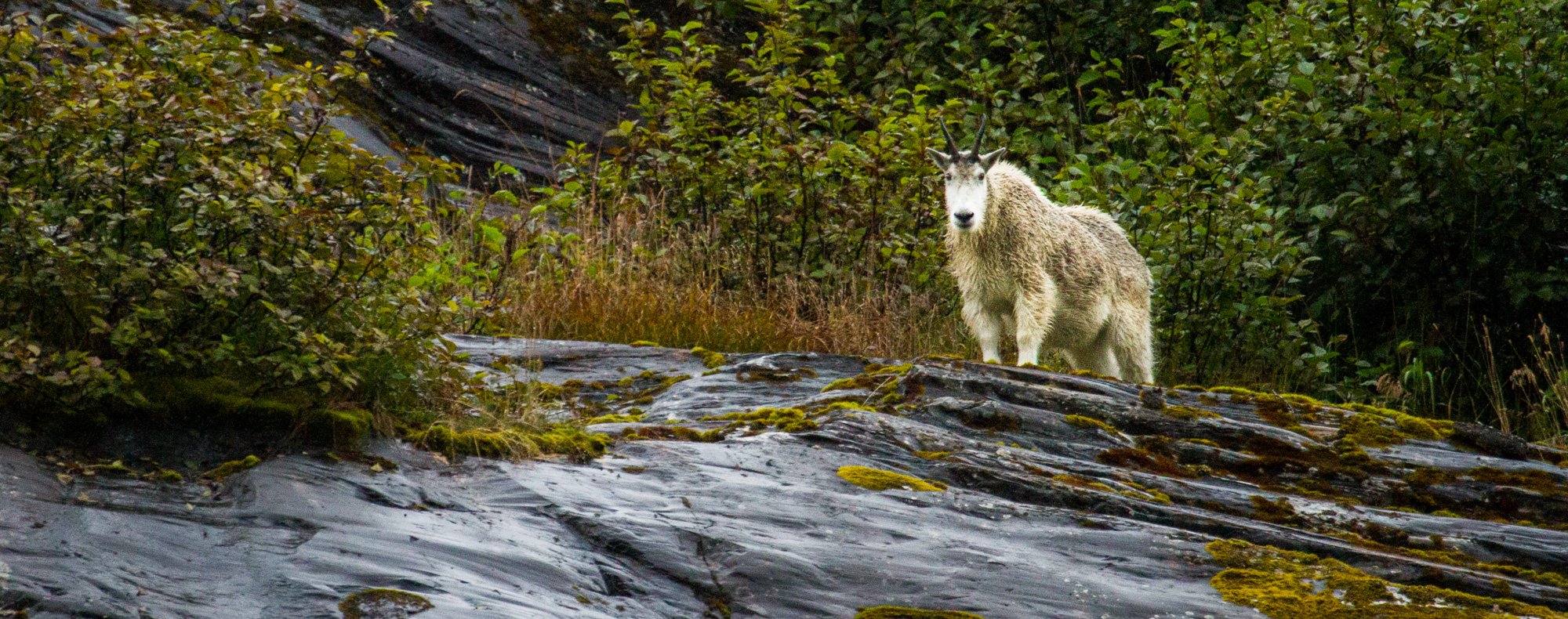 During breakfast, the National Geographic Sea Lion left Johns Hopkins Glacier behind to continue the day’s exploration down bay. We slowly navigated in the proximity of a beautifully shaped monolith called Gloomy Knob. Here, a lot of the rock is exposed and the scarcity of vegetation makes it easy to find wildlife. We found several mountain goats. With brand-new pelage, due to the proximity of winter, these goats placidly rested in the safety of sheer cliffs and high altitude.