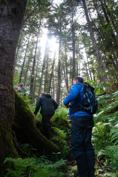 National Geographic Quest arose amidst light clouds within the protected waters of Ushk Bay. This area is known for a salmon stream and yields plenty of opportunity for kayaking and exploring the vast meadows of its inner waterways. On this day’s occasion, guests were able to hike and paddle their way along the coast of Ushk Bay and witness firsthand the life cycle of Pacific salmon making their way upstream. As we transited through Peril Strait, we were lucky to see humpback whales. These immense mammals were “lunge feeding” very near our ship. Being able to witness this event was unique for guests and staff. Lunge feeding is process through which individual whales push their gaping mouths through the surface and collect any fish or planktonic invertebrates in the process. Witnessing this behavior was truly a remarkable experience for all. We will cherish this moment for a lifetime.