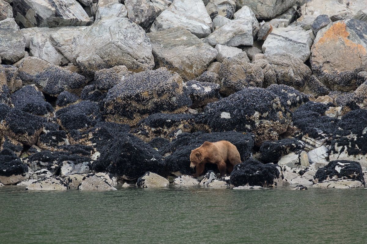 As we set sail and entered the mountainous fjord system, the scale of this magnificent park truly began to take shape. Several humpback whales soon visited us, including the first calf sighted this season. Humpback numbers have been declining within the park in recent years and we took comfort in seeing this healthy calf feeding among the others. Tufted and horned puffins appeared next, as did many other birds feeding on krill and small fish. However, the real highlight of the morning’s transit was a close encounter with a male coastal brown bear. For 30 minutes, we watched the big bruin cruise along the coast, sniffing along the low-tide line for would-be morsels. At one point, we even saw the bear swim in the ocean to avoid having to climb up and over a short cliff face.