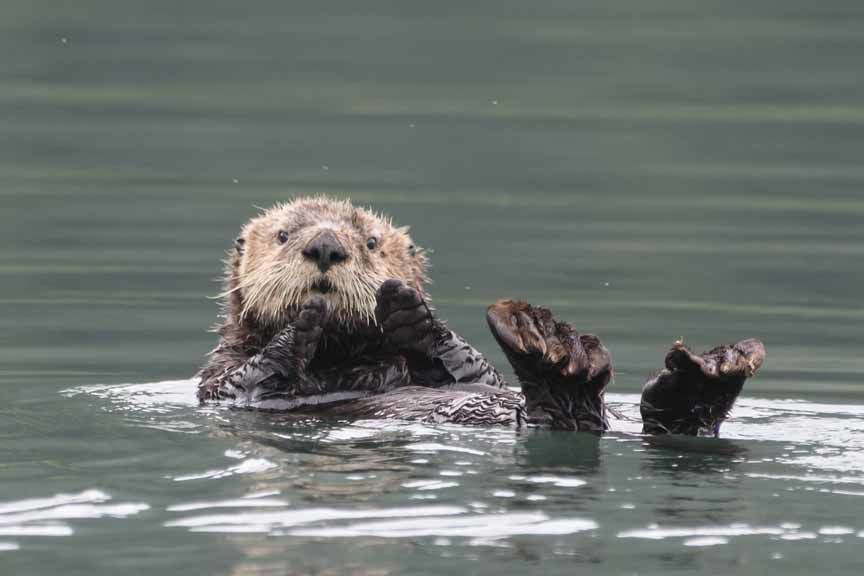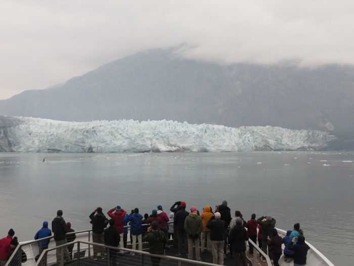 We continued up into Glacier Bay, passing Reid Glacier, named for geologist Harry Fielding Reid who studied Glacier Bay’s glaciers in the 1890s. The occasional sea otter floated past as we sailed on, arriving at the far end of the Bay with both Margerie Glacier and Grand Pacific Glacier in view. Grand Pacific appears as a dirt and rock-covered hill, due to the amount of debris the ice picks up in the softer bedrock of the valley it runs through for 35 miles. In contrast, Margerie Glacier presented us with a spectacular 250-foot-high wall of ice. Occasional chunks crashed off the glacier face, a spectacular display.