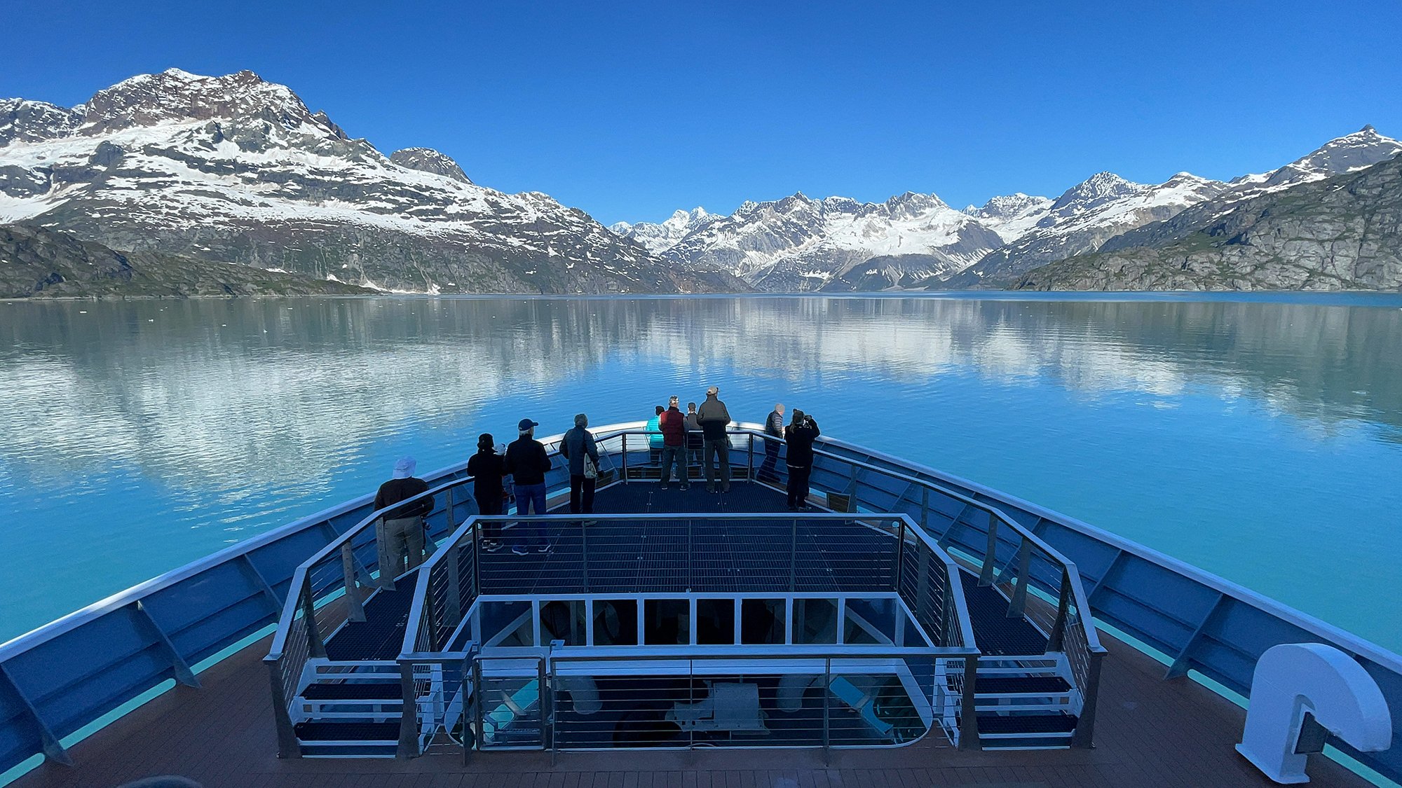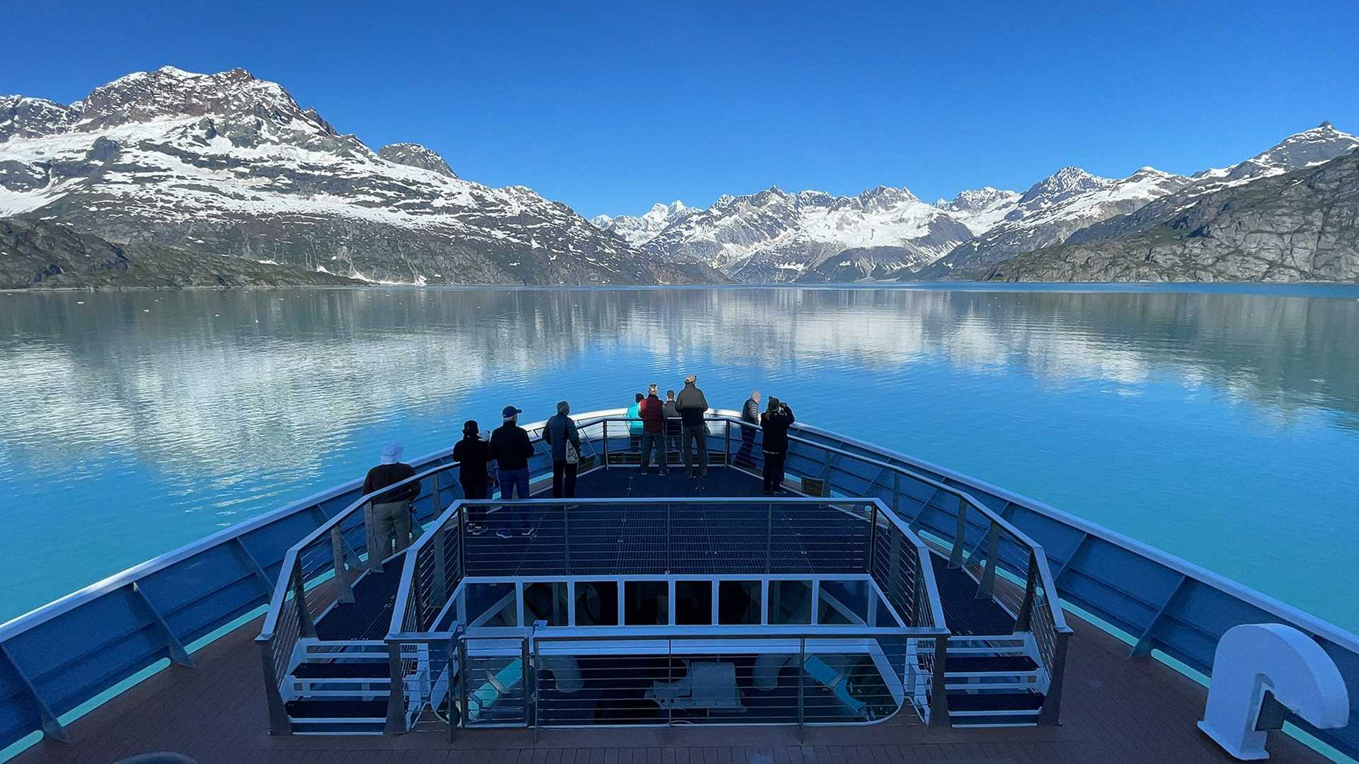 We are starting to wonder if this weather is the new normal in Alaska. Yesterday was pushing 80 degrees and we were greeted again this morning with epic warm weather. The pink sky at 3:30am transitioned into various shades of blue until the sun was beaming on the Fairweather Range as we sailed up Glacier Bay National Park. The perfect reflection of the glaciers, mountains and forest in the water was a magical way to start our day as we made it all the way to the end of the bay. Just after breakfast, we visited Margerie Glacier and witness one of Mother Nature’s kind gifts of a calving tidewater glacier under a blue sky. As we made our way back down the bay, we encountered a brown bear sow and cub on the shore eating crustaceans in the intertidal zone, a few mountain goats on Gloomy Knob, and a couple of humpback whales breeching. What a perfect day in Glacier Bay National Park.