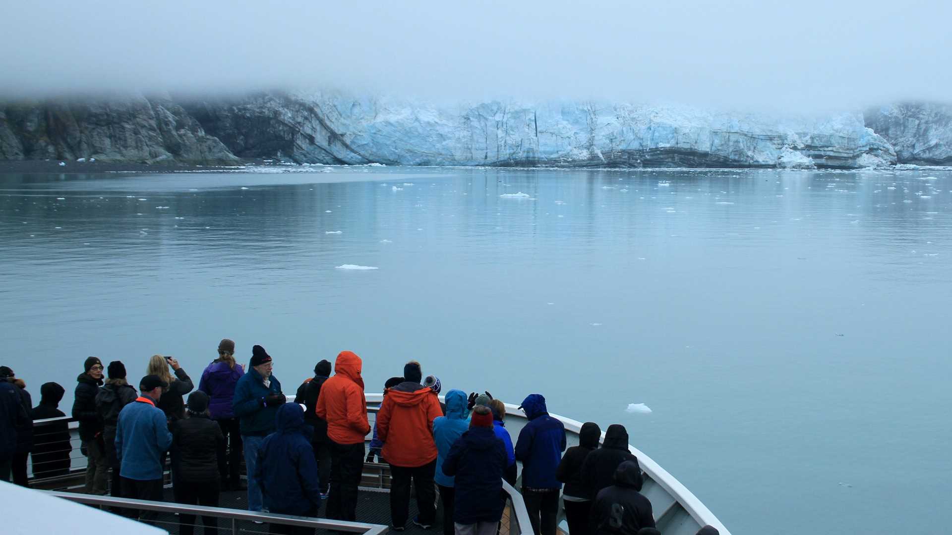 mirror-still water of a mist filled fjord as we proceeded towards Johns Hopkins