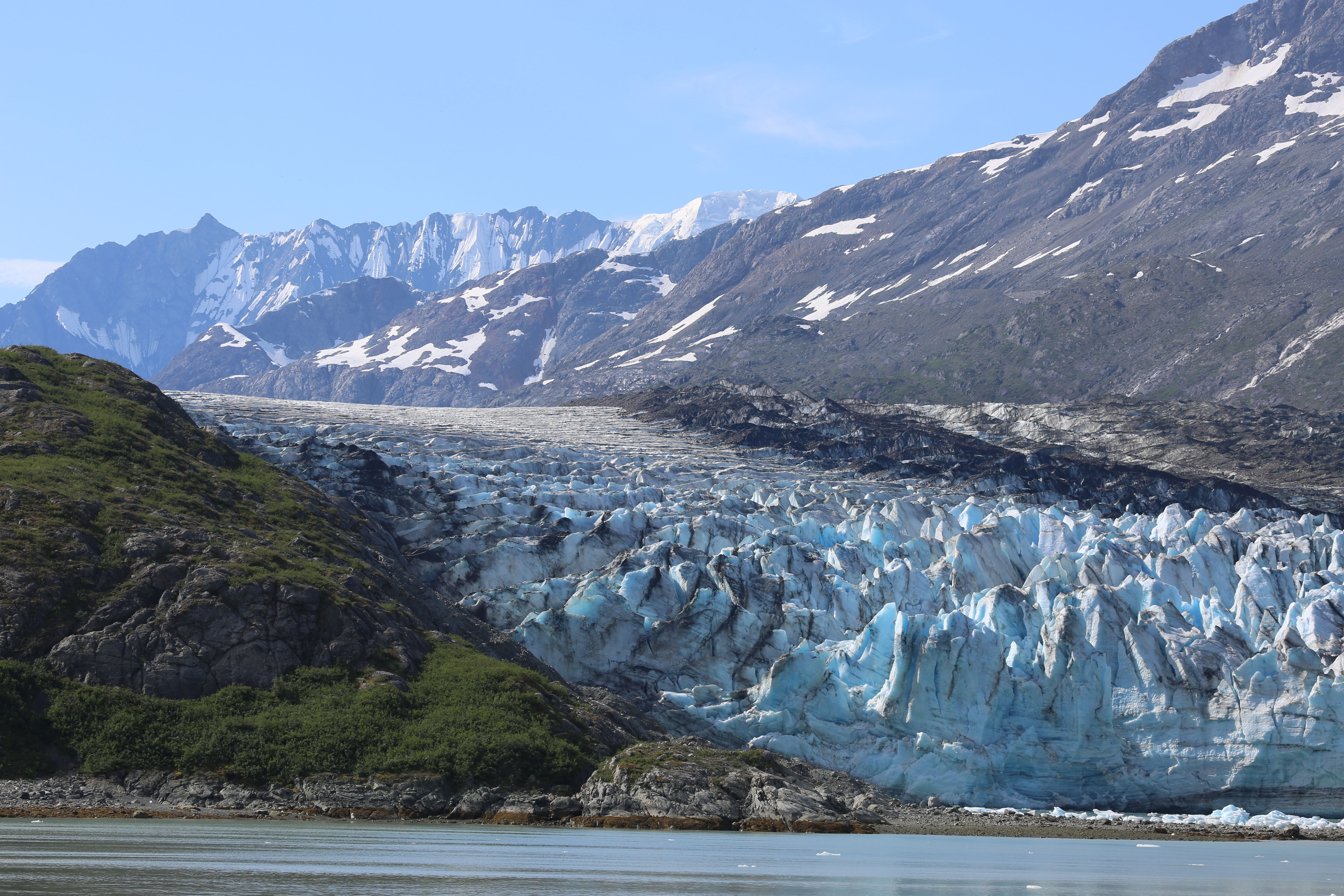Glacier Bay National Park provided guests aboard National Geographic Venture with stunning views of her glaciers, mountains, marine life, and rocky landforms. Today dawned foggy and overcast as we sailed northward up Glacier Bay from Icy Strait. The fog gradually lifted, and the clouds spread open to reveal stunning views of upper Tarr Inlet as we sailed past Reid and Lamplugh Glaciers on our way to Margerie Glacier and, eventually, the debris-covered terminus of Grand Pacific Glacier – one of the main “trunk” glaciers that once filled all of Glacier Bay. Several sea otters occupied a small iceberg as we approached Margerie Glacier, and they suddenly decided to take a swim as National Geographic Venture drifted past. Margerie Glacier, a classic tidewater glacier, was highly active in the bright morning sunshine with her usual loud cracks and booms, signaling the movement of ice. Guests on board National Geographic Venture were rewarded with several spectacular calving events as large blocks of ice fell off the front of Margerie Glacier into Tarr Inlet. As the ship prepared to leave, an enormous mass of ice calved off the center-left side of Margerie, creating an enormous wave that washed over icebergs floating in front of the glacier.