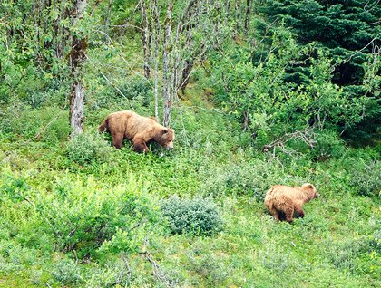 Our first stop was South Marble Island where the Steller sea lions were safely hauled out on a series of small rocks exposed by a glacier around 1845. These protected rocks are also home to a myriad of sea birds like the popular tufted and horned puffins. Our next wildlife sighting was just up the bay in Tidal Inlet and was what many of the guests traveled to Alaska to see - coastal brown bears. This was an extraordinary experience because we witnessed what appeared to be a boar pursuing a sow for mating purposes and a third smaller bear nearby that seemed to be nervously in the wrong place. We will never know what transpired between these bruins once they entered the forest.