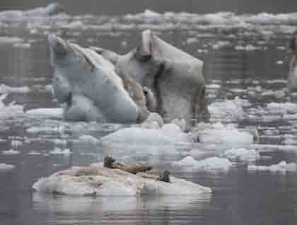 After leaving those two glaciers, we headed towards Russell Cut and later to the Johns Hopkins Inlet, where we spent a great time navigating around growlers, bergie-bits, and icebergs until we arrived in front of the Johns Hopkins glacier. We engaged in the same enjoyable activities that we did in the Margerie, plus another one: harbor seal watching! The Johns Hopkins Inlet is home to an abundant population of seals that rest and give birth to their pups on the floating ice in front of the glacier, where they are safe from land predators like bears or wolves. We observed many adult harbor seals and pups and took lots and lots of pictures.