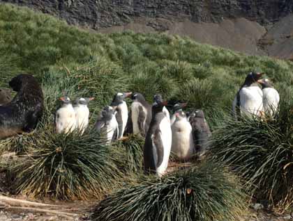 Around 11 a.m., while we were watching episode three of the re-enactment of Shackleton’s journey, we all noticed the weather was improving, which was confirmed by Shaun around lunchtime. The expedition team and the captain had created an exciting plan for the afternoon: a Zodiac cruise inside the bay and a short landing to get up close and personal with the elephant seals, fur seals, king penguins, and Gentoo penguins. After the Zodiac cruise we had a choice to go for a hike up the higher ridge overlooking a beautiful lake and also Godthul Harbour, or to stay on the beach and spend time with all the wildlife there. The beach was full of activity—lots of fur seals, king penguins, and Gentoo penguins. 47 of us decided to go for a nice leg stretch and the rest decided to stay on the beach. The weather got better and better as the afternoon progressed. The winds died down and the sun kept us nice and warm all afternoon. Everyone had such a great time soaking up the magic scenery and enjoying the abundance of wildlife here in Godthul Harbor.