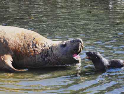Gold Harbour was the destination this morning as we continued our late season expedition of South Georgia. The beach here is not long or deep but the wildlife covers almost every square foot. The stream behind the landing was teaming with fur seals and elephant seals. Farther down the beach thousands of king penguins made their way to and from the shore. The Bertrab Glacier front was an amazing backdrop for the colony as the golden light came from the rising sun. At this time of the season the fur seal pups are large enough to be exploring all aspects of their environment. One of the new arrivals for these small young animals is the largest pinniped on earth, the male southern elephant seal. While a fur seal pup may be 10 lbs, an adult elephant seal may be 10,000. Despite this 1000:1 weight difference, the pups still harass, tease, and bother the elephant seals. It is in their nature to be curious and, in turn, entertaining to us.