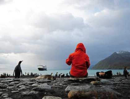 After a good lunch and a quick lie-down, St. Andrews Bay was in sight. This wide bay holds the largest colony of King penguins on South Georgia. The numbers may vary, but a minimum of 150.000 pairs plus chicks can be observed onshore at any time. The bay is fully exposed to the open sea and also to strong winds that frequently plummet from the icecap covering the southern end of the Allardyce Range. Today the landing conditions were fine, with a fresh breeze and a fairly low swell. Red plastic cones were set out to guide our guests at a proper distance from molting and stationary groups of penguins. The sight of a few hundred thousand king penguins on St. Andrews Bay is just mind-blowing and really hard to grasp. Many guests were gaping in awe as they strolled along the edge of the enormous rookery. However, suddenly our fascination for the mass of Kings was replaced by full concentration on saving hats and keeping ourselves upright. An incident of strong, “katabatic” winds erupted in minutes. Captain Oliver sounded on the radio: “all staff and guests onshore, will you please return to the Zodiacs as soon as possible.” The very experienced Zodiac drivers and shore party got a chance to demonstrate their skills under conditions more demanding than normal. So, everyone onshore was brought safely back to the ship before the wind gusts increased even more.