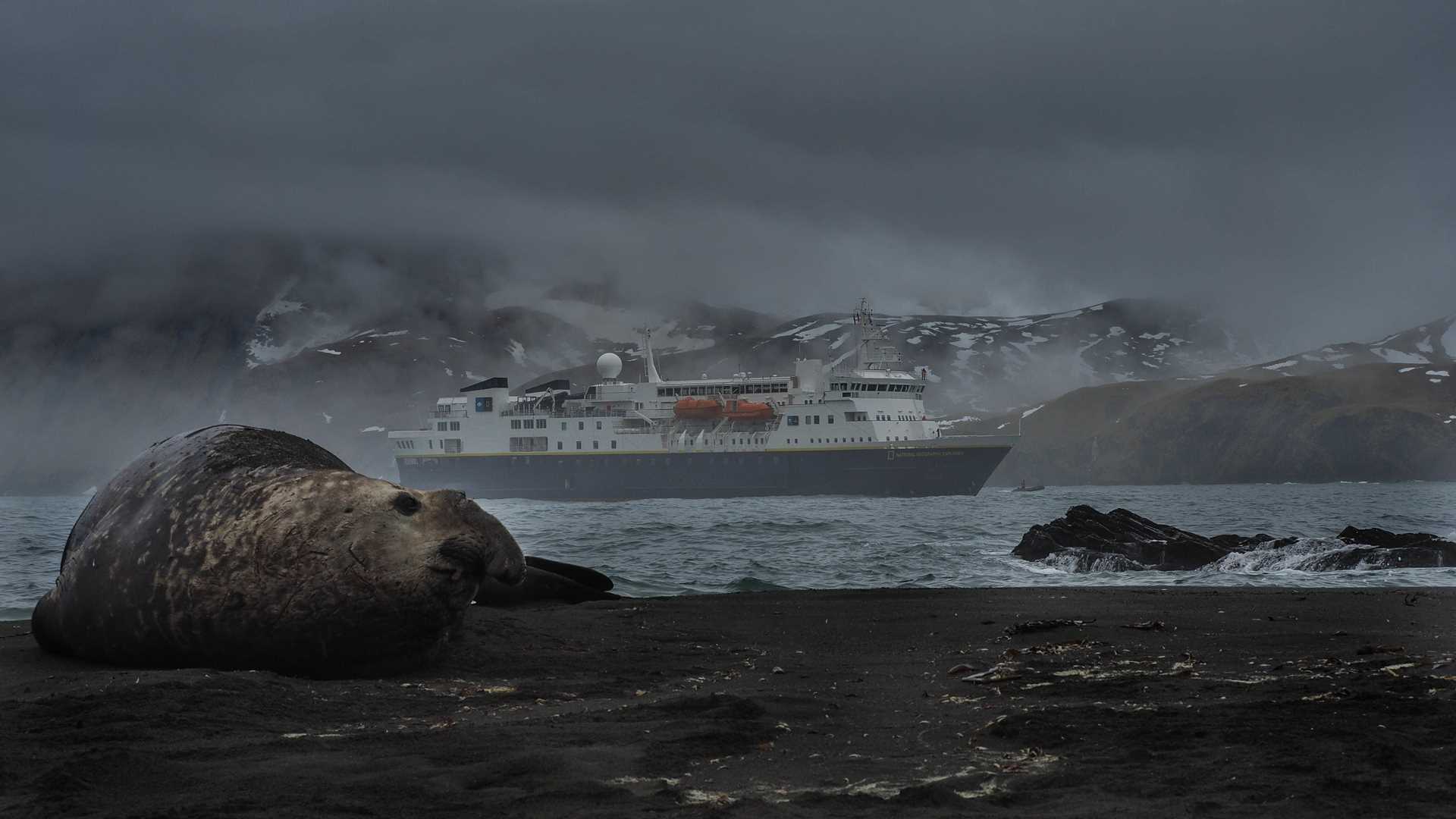 For many people, Gold Harbour is one of the most incredible wildlife destinations on the planet. This morning, we boarded Zodiacs in the dark and headed to the beach at 4:30 a.m. We were met with low clouds and rain—our hopes of a sunrise dashed. But we made the most of the moody sky and magnificent wildlife around us. The beach was covered with elephant seal pups. When taking a moment to sit on the wet sand, one was quickly inundated by penguins and seals. The morning cloud was just the start of a weather system moving across the Scotia Sea. With high winds predicted to head our way, National Geographic Explorer sailed southwest for Antarctica.