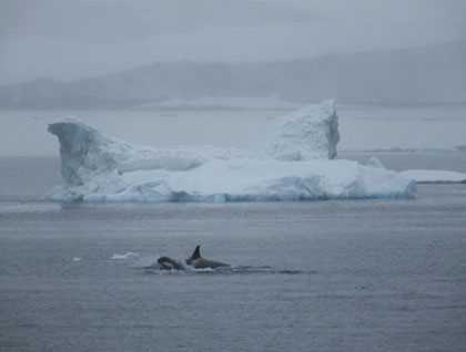 Then it was back to the ship to warm up, but before the evening ‘recap’ talks began, Lucho, the expedition leader, announced that there were Killer Whales off the bow. No time for talks, everyone grabbed binoculars and cameras and went to any vantage point they could find to watch these magnificent creatures as they cruised through the ice flows. We have two Killer Whale scientists onboard, and along with Lindblad naturalist Stephanie Martin as Zodiac driver, they approached the whales in the hope of fixing some tags on them with a cross bow.