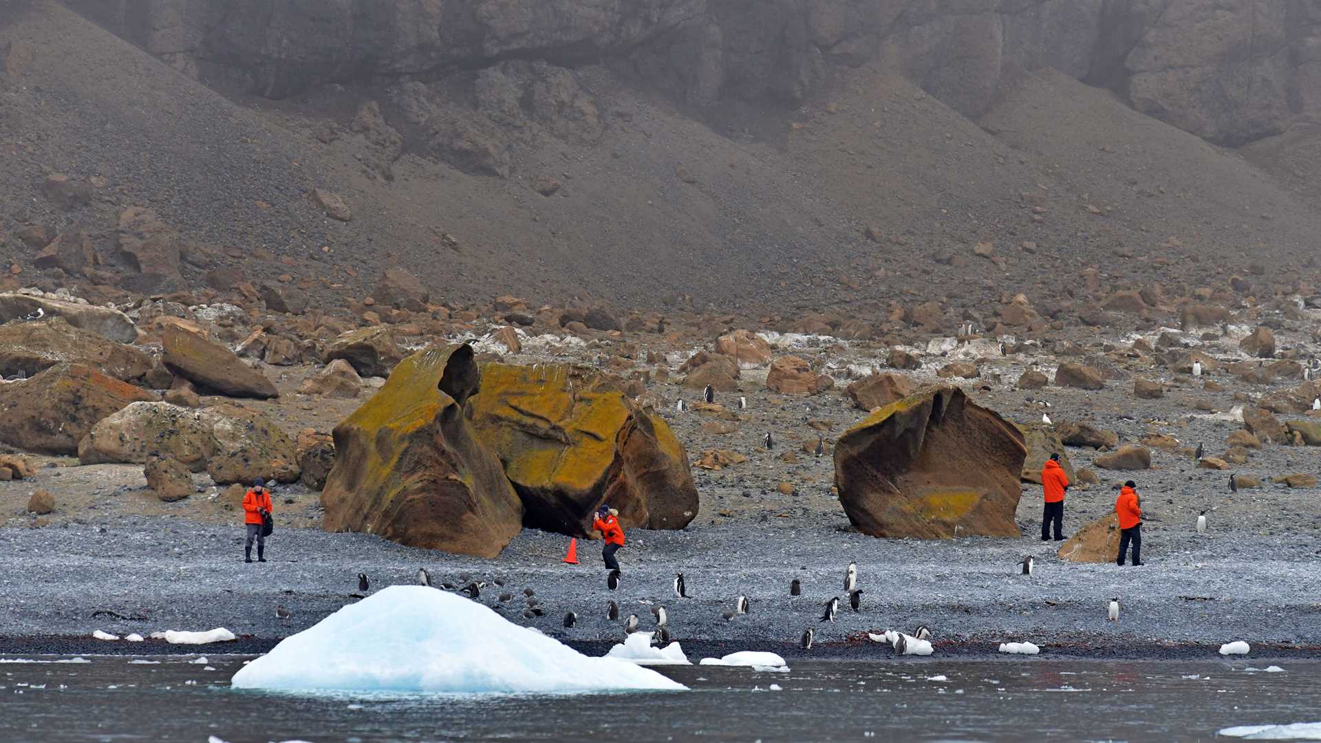 After lunch, we were ready for a landing at Brown Bluff on the western side of the Antarctic Sound. This continental site holds a large colony of Adelie penguins and a small amount of gentoos. With its beautiful volcanic rock formations, Brown Bluff is also a very special spot for geologists. The landing was initially enveloped in a bit of fog, but the weather gradually cleared into sunny skies. We were delighted to see so many chicks of Adelies as well as gentoos. We are fortunate that we have seen all three brush-tailed penguins that breed in Antarctica on this expedition: gentoo, chinstrap and Adélie penguins.