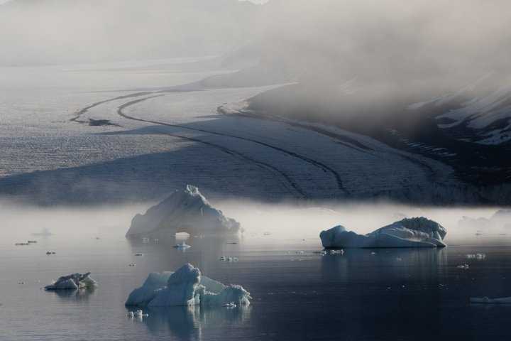 After a couple of days of dense fog, the weather gods looked kindly upon us today. The morning fog quickly burned off, allowing us to get ashore. We explored the stunning Nansen Fjord, seeing polar bear footprints and paddling kayaks among icebergs under blue skies and surrounded by towering mountains.