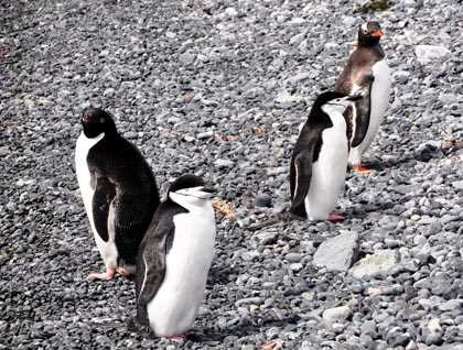 After lunch, one group of intrepid hikers made off for the hills near an abandoned Argentine base. They then made their way through the snow to the penguin colony. The other group chose to maximize their time with the penguins, other birds, and seals near the landing. A Weddell seal lounged nearby and posed for many pictures. The penguins won the day though. While the main colony are chinstrap penguins, noted by the dark line of feathers seeming to keep their black caps on, there were other species present. The “peninsular” penguins are known as the pygoselids or brushtail penguins. These birds, all about the same size, have different feathery configurations from the neck up. The chinstrap is very obvious, the gentoo has visible white earmuffs and brightly colored “lips,” the Adelie is feathered all the way to the edge of the beak with just basic black and white. While views of all three “pygos” can be made on an expedition of several days to the peninsula, we had a rare treat – all three on the same beach and next to each other. The moment was short, but many guests were able to compare all three and see the differences and similarities.