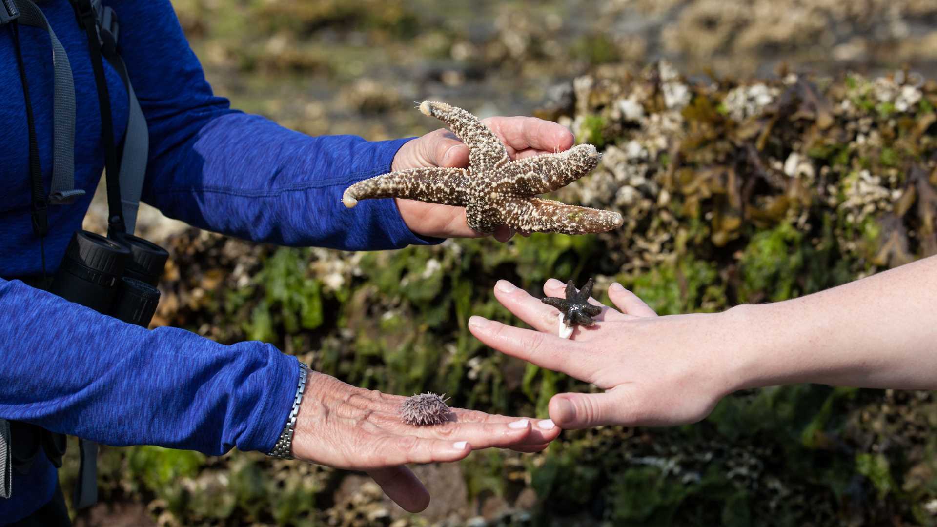One such hike was perfectly timed to explore the intertidal zone. On a low tide of -2 feet, the intertidal area of Saginaw offers a fantastic opportunity for everyone to see ocean critters firsthand. A lot of these animals usually spend their time submerged, but on an uncharacteristically low tide, they may be exposed to air for a short time. Here we saw ochre sea stars, urchin tests, gunnel fish, and living six-armed sea stars. Ochre stars have had a rough time the last few years but have recently made a comeback after a nearly devastating virus swept through the species. Sea star wasting disease decimated much of the population from Oregon up the west coast and into Southeast Alaska, leaving animals wasting away all along the shoreline. Several years later, healthy critters are now making their way back into tide-pools and shallow temperate seas.