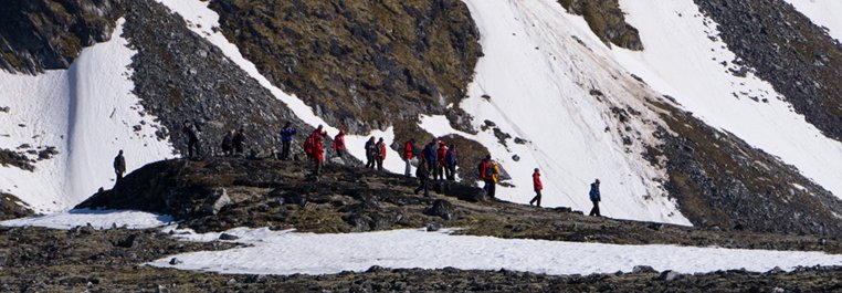 This area of the main island of Spitzbergen, or “jagged Peaks” in Dutch, has a large amount of sharply formed, towering mountains, which was the source of its name when it was first discovered in 1596 by Willem Barents. This landscape was the perfect back-drop for our morning’s options of hiking and kayaking. So, soon after breakfast was over, the guests headed to shore to explore the area by foot and by kayak.