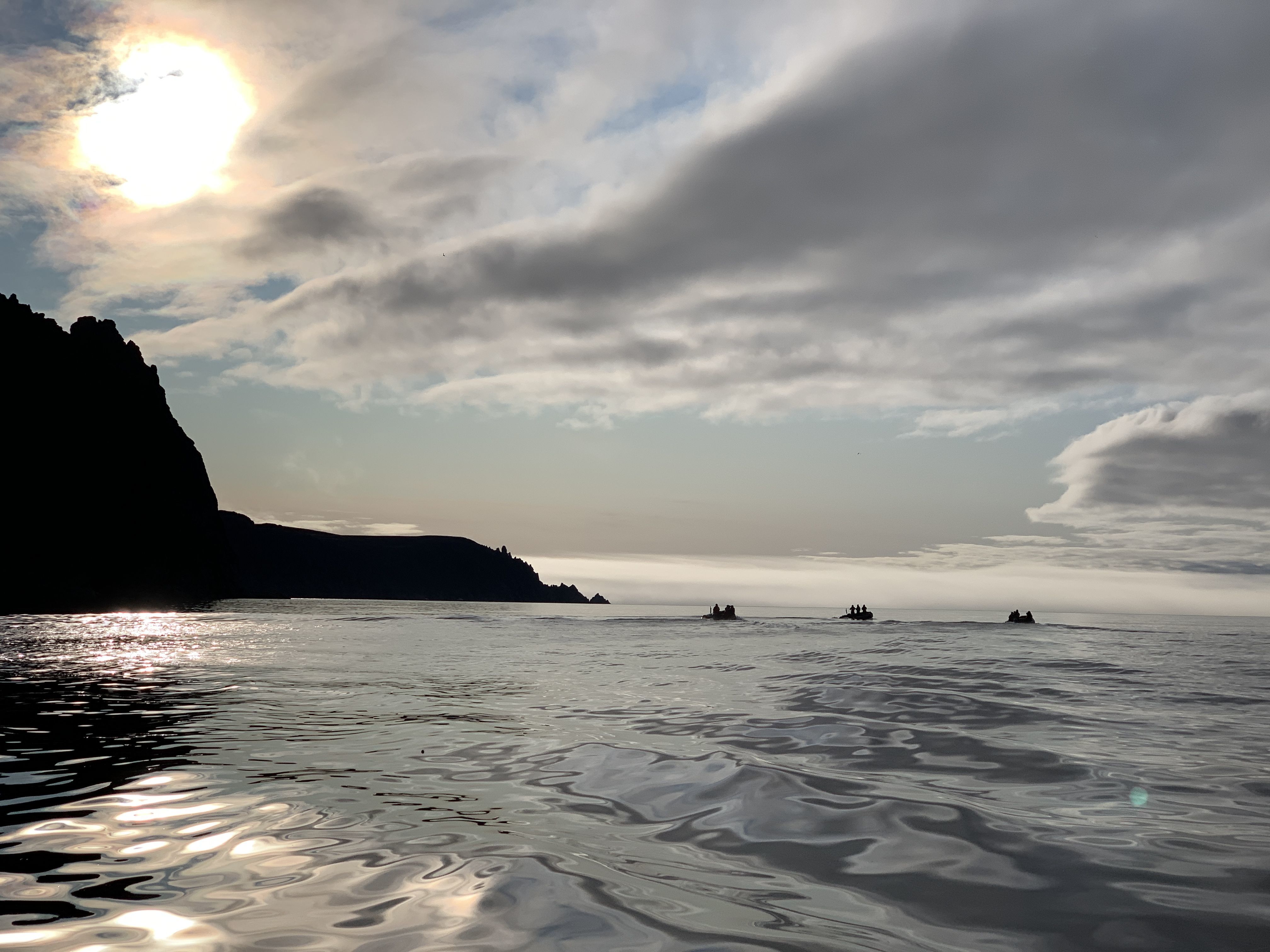 We arrived at Herald Island, a small spiny rock off the east coast of Wrangel, before breakfast. Wisps of fog descended the cliffs, and the closer we got the more bears we saw. With more than 100 bear sightings yesterday, it would be hard to say if we were more excited to see more bears or to see the sunshine. It was truly a gift to have such calm seas and clear skies in this part of the world.