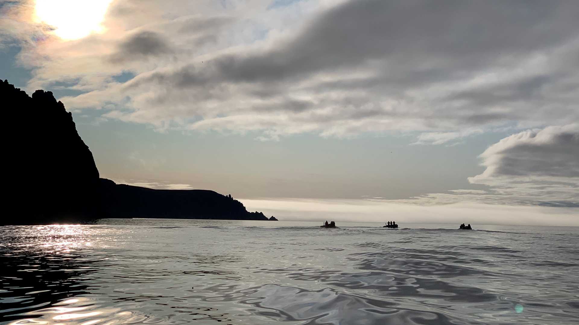 Over the course of the morning, we watched puffins and juvenile kittiwakes (among other seabirds) as we inched closer to a few polar bears that sat on the steep shoreline during our approach. Our Zodiac formation, with careful maneuvering and minimal noise, proved a successful strategy for observing—and not disturbing—wildlife. It’s wonderful to have four staff who live on Wrangel Island as our guides and advisors.