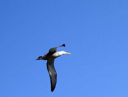 After everybody had returned to our ship, we started the navigation towards the western coast of Hood Island. This afternoon we landed on Punta Suarez, where we went for a long, active hike to observe the colonies of seabirds that nest here, such as Nazca boobies and waved albatross. The albatross only arrived two weeks ago, and a few males were spotted on land, still waiting for their partners. Huge waves crashed along the cliffs, and the sky was full of red-billed tropic birds, albatrosses, and frigatebirds.