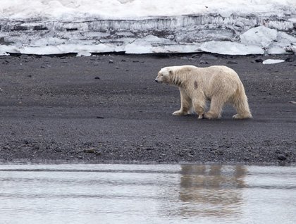 We awoke this morning to an awesome surprise - there was a polar bear on the beach! Our ship, the National Geographic Explorer, had cruised to the eastern end of Hornsund Fjord in southern Spitzbergen, where a eagle-eyed naturalist spotted the bear from miles away. By the time we were all dressed and out on the deck, the ship had approached close enough to the lone bear for us to clearly see it walking on the black beach. We watched it as it walked, sat, and even laid down on the beach. The bear was close enough for us to see its eyes looking at us, the hair on its feet, and the scar on its leg.