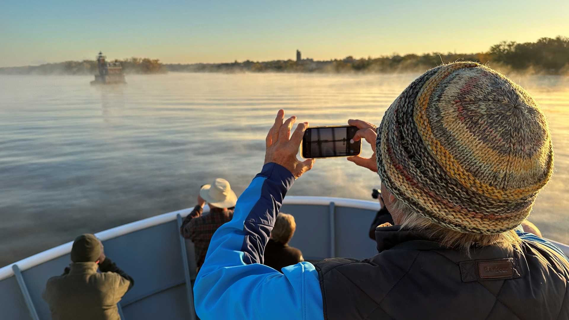 It was a crisp fall morning on the Hudson River as we followed a barge being towed past the city of Hudson. The fall colors on the hills and the mist emanating from the water created the perfect atmosphere for some early morning photography of the Hudson-Athens Lighthouse from the ship. After breakfast, we divided into two groups, and each group visited Olana. A National Historic Site, Olana was Frederic Edwin Church’s house. One group did a long hike up the hill in addition to visiting the grounds at the house. While visiting Olana, many walked a path with views of the Hudson River. Each group also visited the Thomas Cole National Historic Site, which includes the house, Cole’s old studio, and a reconstruction of his ‘new studio.’ We were exceedingly lucky because the current exhibition in the new studio is comprised of original painted studies for Cole’s extremely popular series of paintings entitled Voyage of Life.