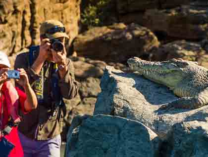 As dawn broke through a myriad of pink and orange colors, the National Geographic Orion dropped anchor at the beautiful bay of Prince Frederick Harbour. We were surrounded by an impressive rugged sandstone landscape, dolerite intrusions, rainforest ravines and beautiful turquoise waters. This was the start of a magnificent day in one of the most stunning locations of the Kimberley region, the Hunter River. The river meanders downstream from its main tributaries of the Roe River before flowing into the Indian Ocean. It is home to a rich and diverse variety of wildlife, from top predators like the saltwater crocodiles and white bellied sea eagles to hoping mud skippers and sacred kingfishers flashing their iridescent feathers.