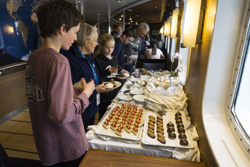 We started our day at a small indentation in the shore of Tracy Arm. Just after breakfast we heard briefings about kayaking and about how to behave safely in bear country–a good thing, since both were soon needed! The forest here is a rich deep green. Seemingly out of context in such a lush environment, big icebergs floated nearby, some the brightest, cleanest shade of white, others a beautiful blue. Big bergs are common here because they are too deep to float over the shallow moraine at the mouth of Tracy Arm. Kayakers and boaters enjoyed close views of these bergs. Others walked into the forest. Here they met “standard” coastal temperate rain forest, dominated by spruce and hemlock trees. Returning along the shoreline, walkers encountered brown bears! A sow and three cubs were foraging along the forest edge. Bears feast on salmon when available, but otherwise they are mostly vegetarian. Lacking salmon, these ate the next best thing–salmonberries. How thrilling and delightful to see bear cubs standing to look at us! These are bears we have seen before. They were fairly comfortable around us, which allowed us to get good views. Let us hope they do not pay for their tolerance. This area is in no way protected, and some of our “friends” in similar places have recently been shot for “threatening” those who carry rifles rather than bear spray.
