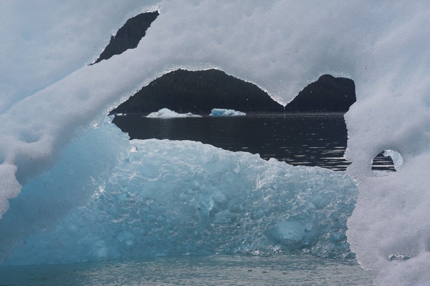 In the afternoon we traveled up Dawes Inlet. Water changed from dark green to a beautiful milky jade and at last a cloudy gray. Icebergs became more and more numerous. And at last we beheld the Dawes Glacier. Draining the Stikine Icefield, this is one of the southernmost tidewater glaciers in the hemisphere. We jumped into our little boats for a closer look. From an intimate perspective, the many bergs were even more impressive, with colors ranging from silty black to the most intense sapphire. In size they varied from rock-hard marbles to tolerable tennis courts. We passed seals on the way to the glacier. Come to bear and nurse their young, the seals are here at a vulnerable time, and we did what we could not to disturb them. The glacier, without familiar forms for scale, defied comprehension. Only with a will could we remember that its face was 25 stories high. The calving of the glacier was unusually good. All saw great walls tumble from the glacier’s face, and, better yet, the silent but awesome birth of huge blue bergs in a submarine calving.